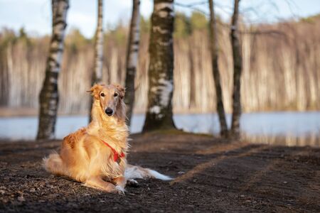 Russian Wolfhound Dog, Borzoi near the beach. Sighthound, Russkaya Psovaya Borzaya, Psovi. Killer of wolves. One of the fastest hunting dogs in the world. Springtime, Outdoors, Close Up Portrait.