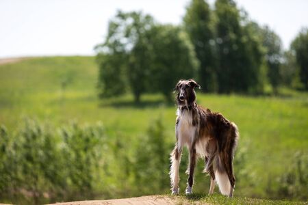 Brindle dog borzoi walks outdoor at summer day, russian sighthound, one year old
