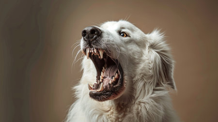 Great Pyrenees, angry dog baring its teeth, studio lighting pastel background