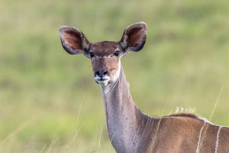 Cute elegant Kudu female head close up and portrait. Wildlife Safari in the Kruger National Park, the main travel destination in South Africa. Focused on eyes.