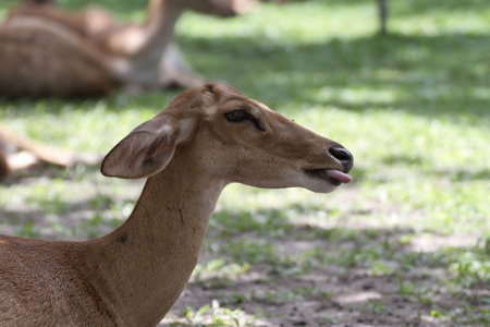 Yellow deers eating grass at sunny day in the zoo.