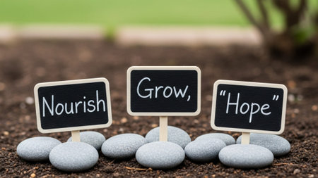 Cinematic wide shot of slate garden markers labeled 'Nourish,' 'Grow,' 'Hope,' surrounded by smooth grey pebbles on dark soil. Spring gardening concept.