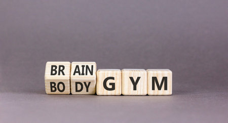 Body vs brain gym symbol. Concept words Body gym to Brain gym on beautiful wooden cubes. Beautiful gray table gray background. Business healthy lifestyle and body vs brain gym concept. Copy space.