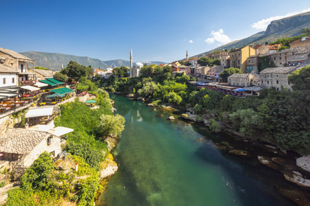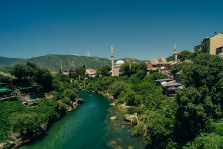 Neretva river in Mostar town, Bosnia and Herzegovina, Europe. Scenic view of a historic town along a river with architecture, lush greenery, and mountains in the backdrop under a clear blue sky.