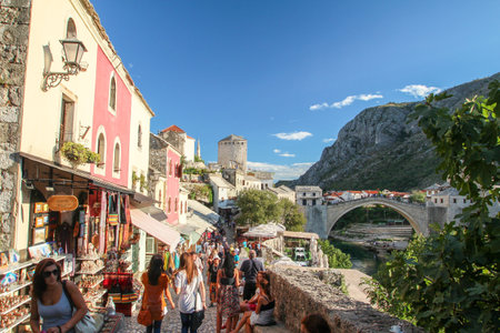 MOSTAR, BOSNIA AND HERZEGOVINA - AUGUST 05, 2015: Tourist and locals walking near Old bridge in Mostar. Included to the UNESCO heritage