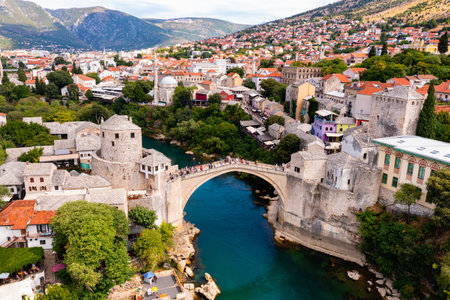 Aerial view of Stari Most old medieval bridge in Mostar, Neretva river, Bosnia and Herzegovina. Tourists walking on the bridge. Summer landscape of old town. Mosque on background.