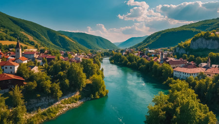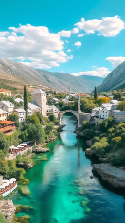 A picturesque view of a historic bridge spanning a vibrant river, with lush greenery and an idyllic townscape under a bright blue sky. Mostar, Bosnia and Herzegovina.