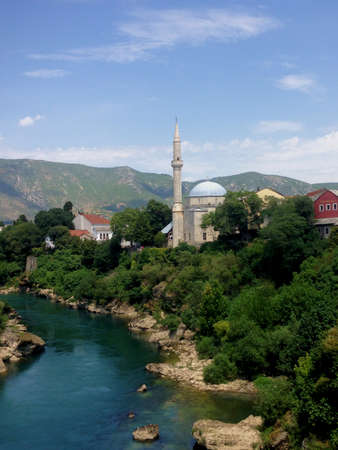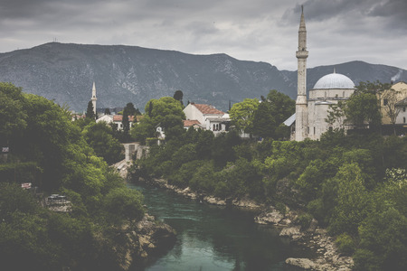 Mostar, Bosnia Herzegovina - May 1, 2014: Nerteva River and Old City of Mostar, with Ottoman Mosque