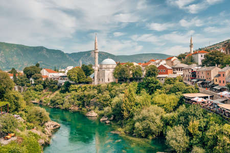 Beautiful view of the Karadjozbegov mosque jamia on the banks of the Neretva River in Mostar, Bosnia and Herzegovina
