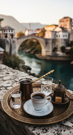 Traditional steaming coffee on an ornate tray overlooking an old bridge in a historic town. Authentic travel experience and local culture.