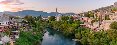 Old town of Mostar and Neretva River at sunset time in Bosnia and Herzegovina
