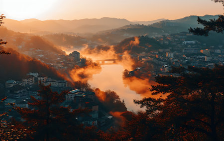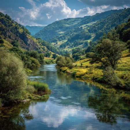 A tranquil river winds through a verdant valley framed by lush mountains under a scenic sky, offering a perfect escape into nature's serene beauty and calm environment.