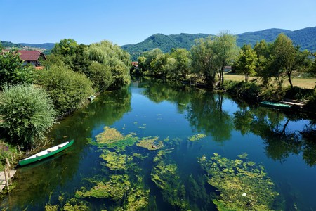 Landscape with river and houses in Bosnia Herzegovina , Europe . Trebinje riverside town in Balkans
