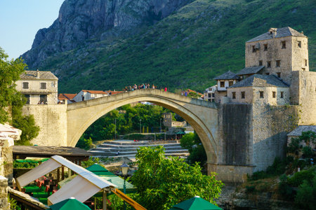 A beautiful view of the old bridge across the Neretva River in Mostar, Bosnia and Herzegovina, on a sunny summer day