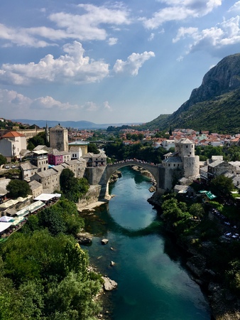 View of Mostar bridge over Neretva river, Bosnia and Herzegovina, daytime