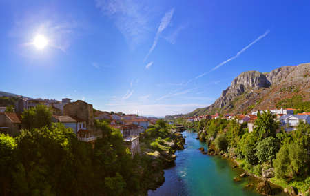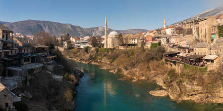 Beautiful view of the medieval town of Mostar from the Old Bridge in Bosnia and Herzegovina