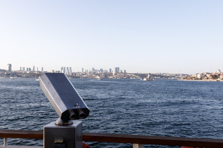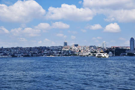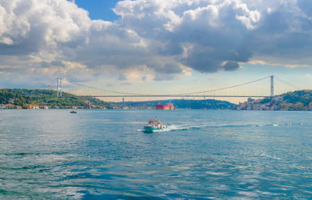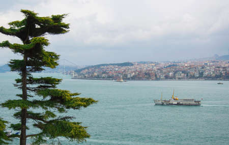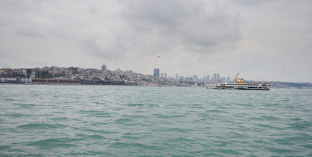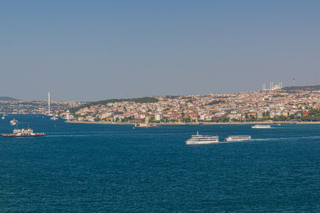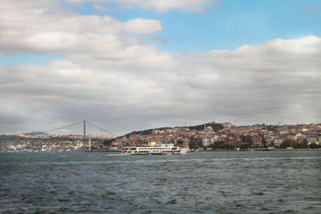 Unusual Istanbul skyline, Turkey. Ferry is crossing the Bosporus. Awesome view of the Bosporus strait.