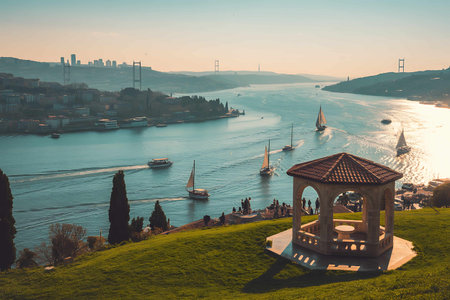 Panoramic view of Bosphorus Strait and Bosphorus Bridge in Istanbul, Turkey