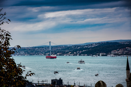 bridge over Bosphorus strait, and moored ships in Istanbul, Turkey