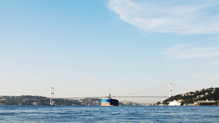 A ship is approaching a bridge at the Bosphorus, Istanbul.