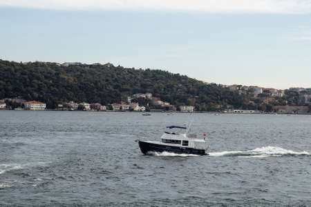 View of a yacht and fishing boat passing on Bosphorus and Baltalimani neighborhood on European side of Istanbul. It is a sunny summer day. Beautiful travel scene.