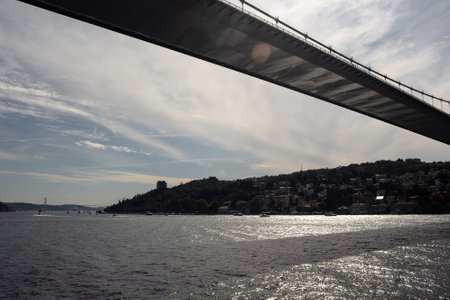 Bottom view of FSM bridge on Bosphorus. Rumeli Hisari neighborhood on European side is in the background. It is a sunny summer day. Beautiful travel scene.