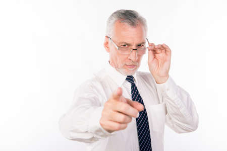 Old businessman holding his glasses pointing straight