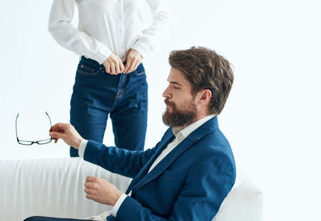 A man with documents in a suit and a woman for a job interview
