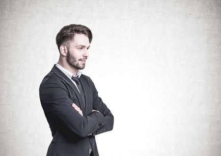 Side view of a pensive young businessman with a beard. He is wearing a suit and a tie and standing with crossed arms. A concrete wall background.