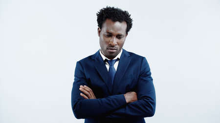 offended african american businessman in formal wear standing with crossed arms isolated on blue