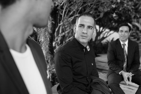 Three multi ethnic bearded businessmen together against brown background