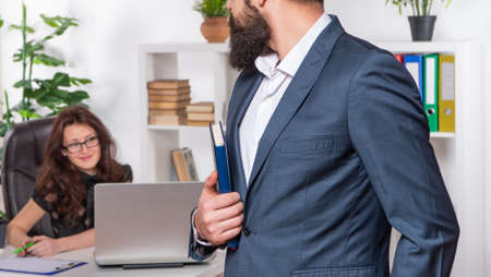 make analysis of new strategy. boss and employee work with documents. secretary hold folder. modern office life. woman and man do business. businessman consulting with colleague