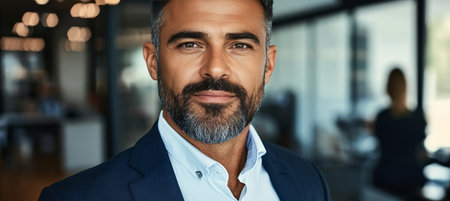 Portrait of confident elegant business man wearing fashion suit standing by window in modern office room, looking away. Front view of bearded businessman posing at workplace.