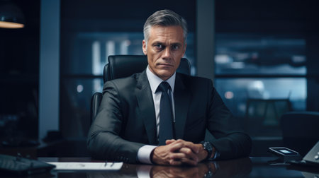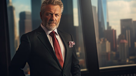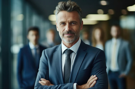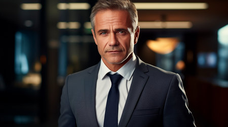Confident executive man in his 50s showing leadership and business acumen in a corporate setting.