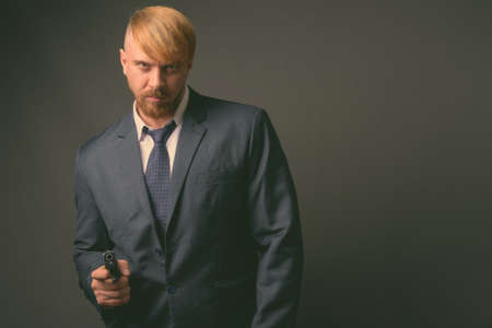 Confident Businessman in Suit Showing Determination in Professional Studio Portrait Setting