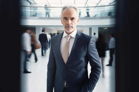40s mature male executive, smiling face, standing in blur background of busy hall. Generative AI AIG20.