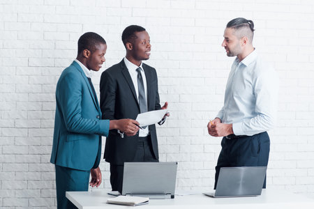 Two new employees from abroad meet with leading manager for signing papers. Interracial cooperation.