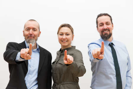 three business woman and men are pointing with their fingers to the viewer