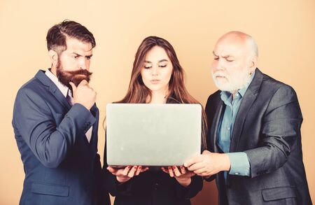 Really busy. Online work. business partners discuss problem. confident mature men with laptop. woman secretary looking in computer. businessmen team. communication meeting. modern technology