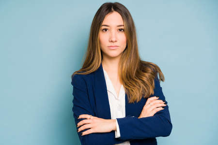 Caucasian woman wearing a business jacket and looking serious and confident with her arms crossed