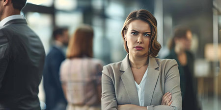 Woman with arms crossed in the middle of a workspace generative ai