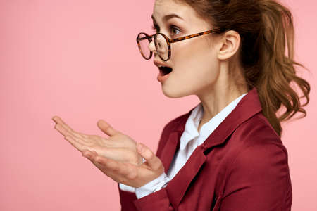 Elegant woman in suit and glasses official pink background