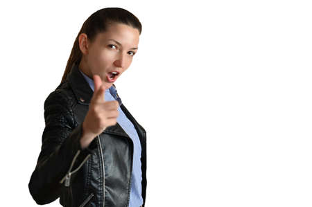 Portrait of a girl showing emotionally finger on an isolated background