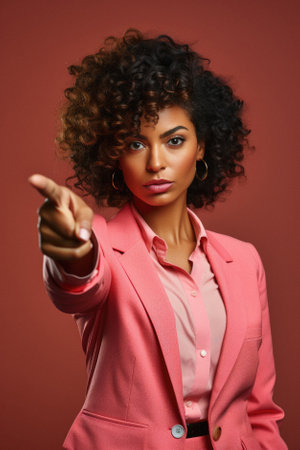 Beautiful african american woman in pink suit on red background.