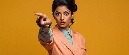 Shocked african american businesswoman pointing with finger at camera isolated on yellow.