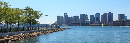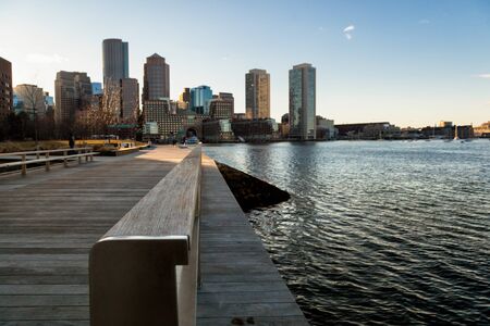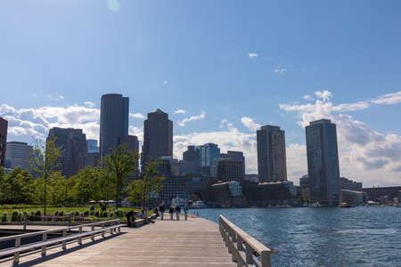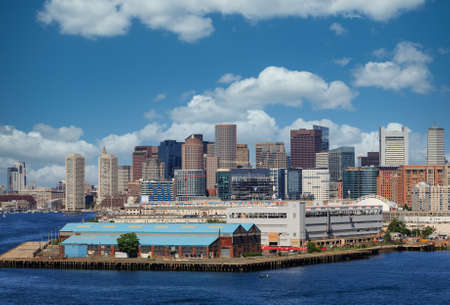Boston cityscape in sunny day, view from harbor on downtown, Massachusetts, USA. High quality photo