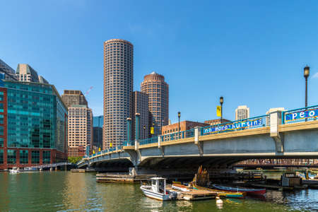 BOSTON,MASSACHUSETTS,USA - JULY 15,2016: Boston skyline and Northern Avenue Bridge. Built in 1908, it was closed to vehicle traffic in 1999