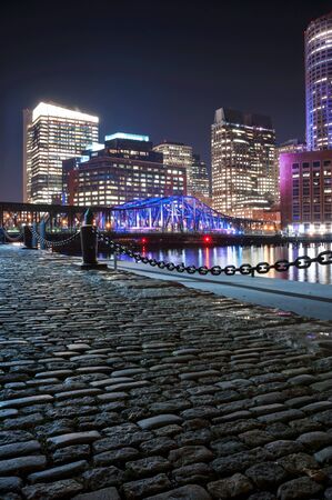 Boston Harbor and Financial District at night in Boston, Massachusetts.