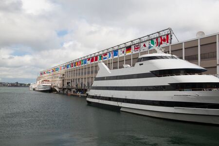 Boston, USA - April 28, 2015: Tall buildings and moored ferry boats with people in the bay in Boston, USA. The city is surrounded by various water facilities