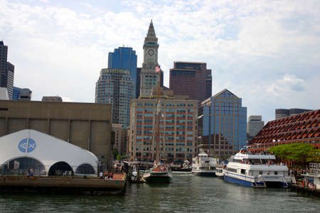 Boston,Massachussetts,USA - July 2,2016: Architecture in Boston harbor. It is a natural harbor and estuary of Massachusetts Bay. Boston tourism annually brings about 8 billion dollars